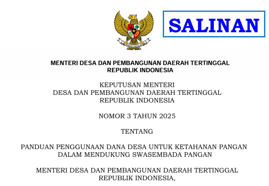 Kepmendesa PDT Nomor 3 Tahun 2025 Panduan Penggunaan Dana Desa...
